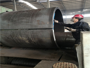 ①卷板成型的钢管在每段焊接完毕后,需上机‘校圆’,在弧度偏小的部位往复滚卷,去除内应力,提高钢管圆度。